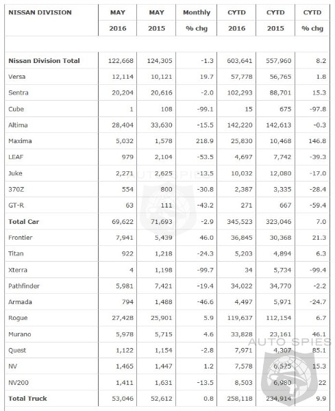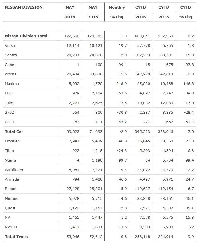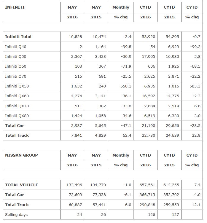 Nissan Group today announced total U.S. sales for May 2016 of 133,496 units, a decrease of 1 percent over the prior year.Nissan highlights: