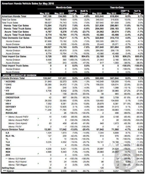 "We continue to see solid demand for Honda cars and light trucks, and all indicators point to a strong summer selling season for Honda," said Jeff Conrad, senior vice president and general manager of the Honda Division. "With our balanced lineup and an all-new Ridgeline pickup and restyled and reengineered 2017 Accord Hybrid launching this summer, we remain bullish on our prospects for a third consecutive yearly sales record for the Honda brand."