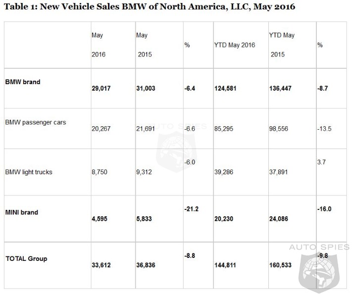 Sales of BMW brand vehicles decreased 6.4 percent in May for a total of 29,017 compared to 31,003 vehicles sold in May, 2015. Year-to-date, BMW brand is down 8.7 percent on sales of 124,581 compared to 136,447 sold in the first five months of 2015.
