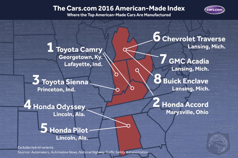 The Toyota Camry topped the American-Made Index for the second consecutive year, while the No. 2 Honda Accord and No. 5 Honda Pilot returned to the index for the first time since 2012. Also back are five AMI regulars: the Toyota Sienna, Honda Odyssey and GM's Michigan-built crossovers — the Chevrolet Traverse, GMC Acadia and Buick Enclave. (GM will assemble the redesigned 2017 Acadia in Tennessee, not Michigan, but it wasn't yet on sale during the period covered here, which is Jan. 1 to May 31.)