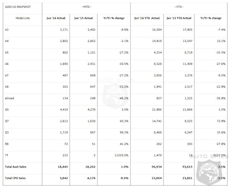 Demand for Audi SUVs bolstered June sales with a 29 percent increase over June 2015. The Q3 posted 1,719 vehicles sold for the month, a 98 percent increase over last June. Sales of the Q5 rose 3.5 percent over last June, to 4,419 vehicles. Q7 sales rose 60 percent from last June, to 2,613 vehicles.