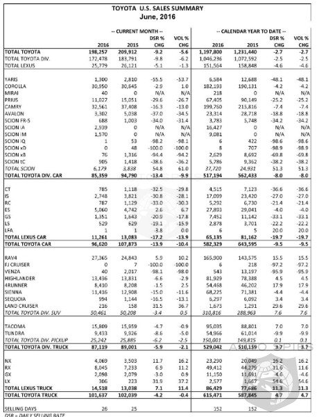 Toyota division posted June 2016 sales of 172,478 units, down 6.2 percent on a volume basis, and 9.8 percent on a DSR basis.