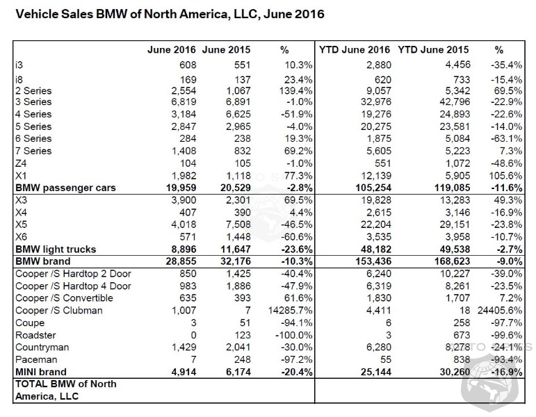 In total, the BMW Group in the U.S. (BMW and MINI combined) reported June sales of 33,769 vehicles, a decrease of 11.9 percent from the 38,350 vehicles sold in the same month a year ago. Year-to-date, BMW Group sales are down 10.2 percent on sales of 178,580 in the first half of 2016 compared to 198,883 in the same period in 2015.