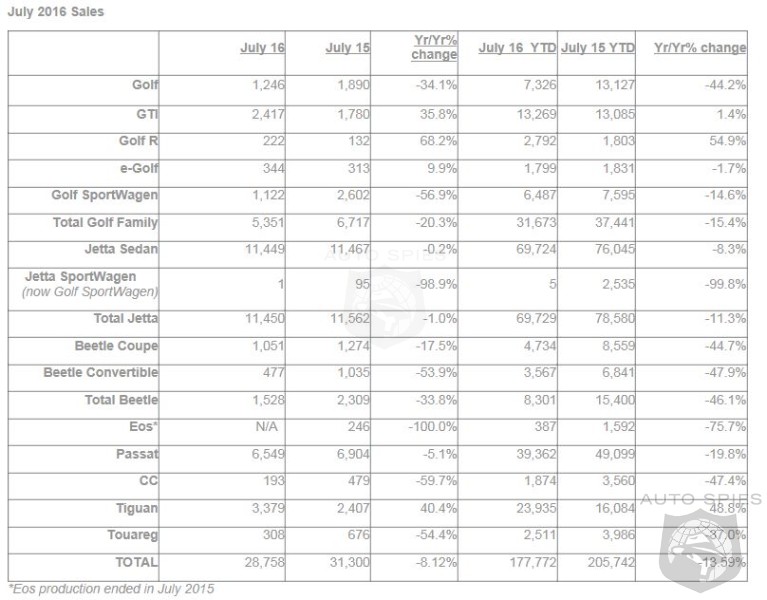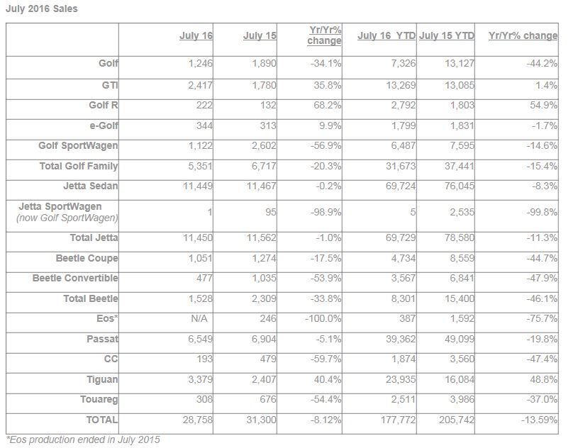 Volkswagen of America, Inc. (VWoA) today reported sales of 28,758 units delivered in July 2016.