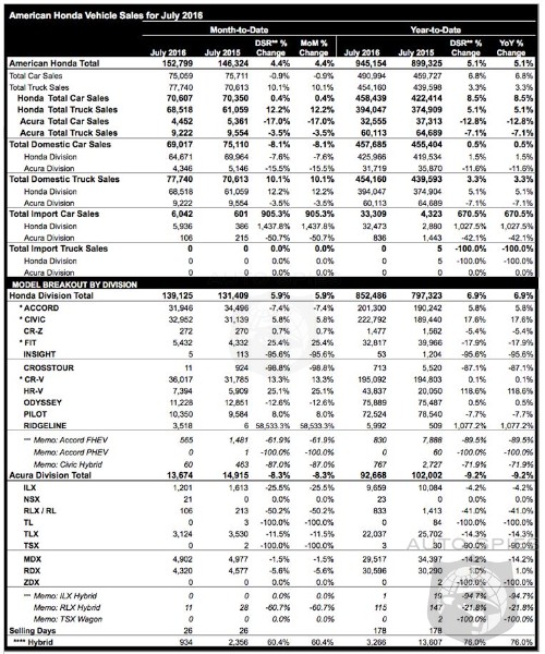 American Honda Motor Co., Inc. today reported July sales of 152,799 Honda and Acura vehicles, a 4.4 percent gain over last July and a new July record. Total American Honda truck sales set a new all-time monthly record of 77,740 sales to jump 10.1 percent. The Honda Division set a new July total vehicle sales record, rising 5.9 percent on sales of 139,125, while Honda trucks set an all-time monthly record with a 12.2 percent increase on sales of 68,518 vehicles. Honda car sales were up 0.4 percent for the month, netting 70,607 sales. The Acura Division, though gaining momentum with the launch of key new models, posted July sales of 13,674, a decrease of 8.3 percent versus last year.