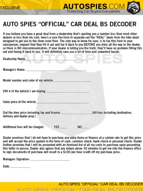 Must read! How to make sure your dealer is telling the truth This will definitely save you lots of time and hassles Be sure to use this valuable tool the next time you negotiate for a car... Special thanks to Jason for this great form! email andre: avoglezon@mbzlongbeach.com