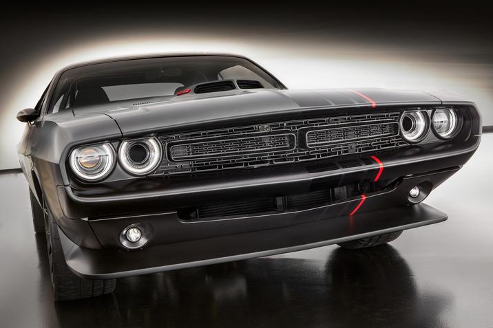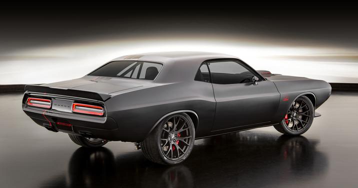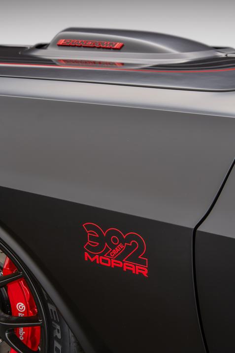 The Shakedown Challenger drives 485 horsepower to the pavement via a Viper Tremec T6060 six-speed transmission and is further augmented by a Mopar concept cold-air intake and Mopar custom dual exhaust with black powder-coated Mopar exhaust tips. The custom front and rear suspension is lowered, dropping the Shakedown Challenger closer to the road — or to the track — creating a capable performer versatile enough to tackle the street or Pro Touring/Drift-type motorsports competition. Braking power is supplied by Brembo-red SRT® Hellcat six-piston front brakes and four-piston rear brakes.