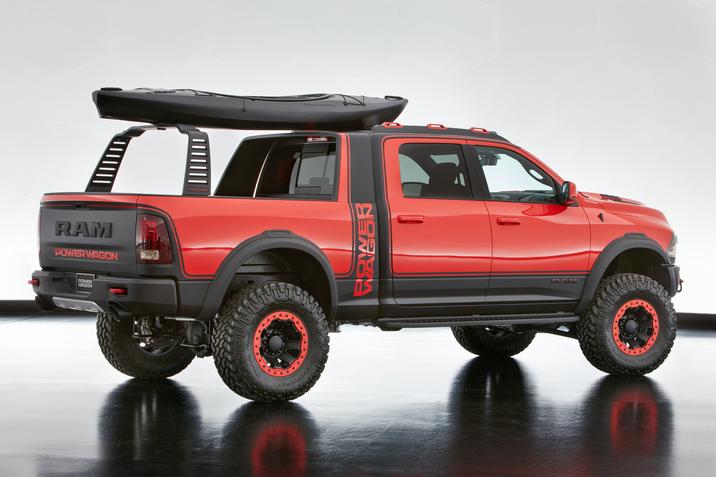 That adaptability is showcased in the 6-ft. x 4-in. bed of the Macho Power Wagon, where a Mopar concept Satin Black accessory sliding RamRack securely stores toys to fit a variety of lifestyles. The Ram Rack is designed to neatly slide up and stow under the cab’s sail panel when not in use. The bed rack works in concert with a RamRack roof system that locks down items with six unique tie downs.