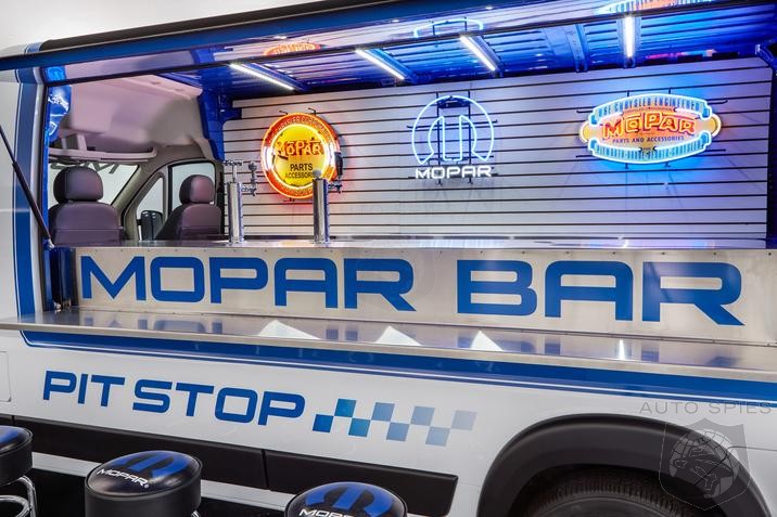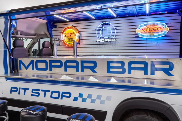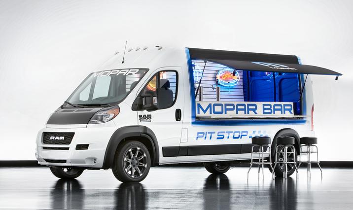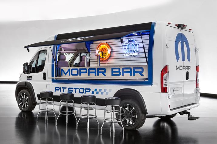 ProMaster Pit Stop is Mopar-customized with a hinged door on the driver’s side, outfitted in Mopar graphics, that swings open towards the roof. A drop-down bar counter hinges and opens out from the side as well, and the best-in-class cargo width between the wheel wells of the ProMaster has been modified with keg refrigeration capacity to serve cold, thirst-quenching beverages from four on-board taps. Of course, ordinary taps wouldn’t suffice — Mopar T-handle, billet aluminum, cue ball and pistol grip shifters help dish out drinks. An added “Brewmaster” badge is appropriate, as Mopar stools stored in the cargo area can be placed out front to quickly create a soda shop (or pub) on wheels.