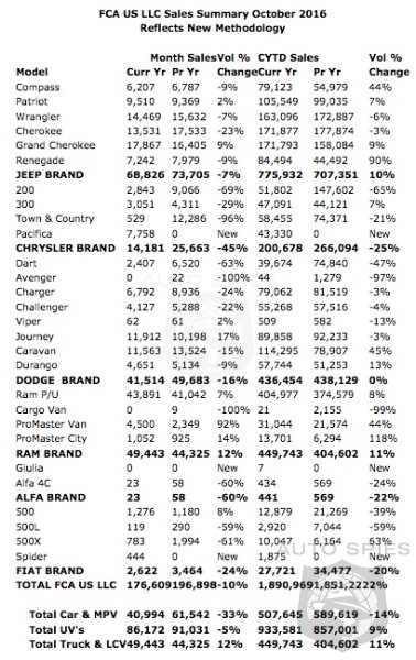 FCA US LLC today reported U.S. sales of 176,609 units, a 10 percent decrease compared with sales in October 2015 (196,898 units).