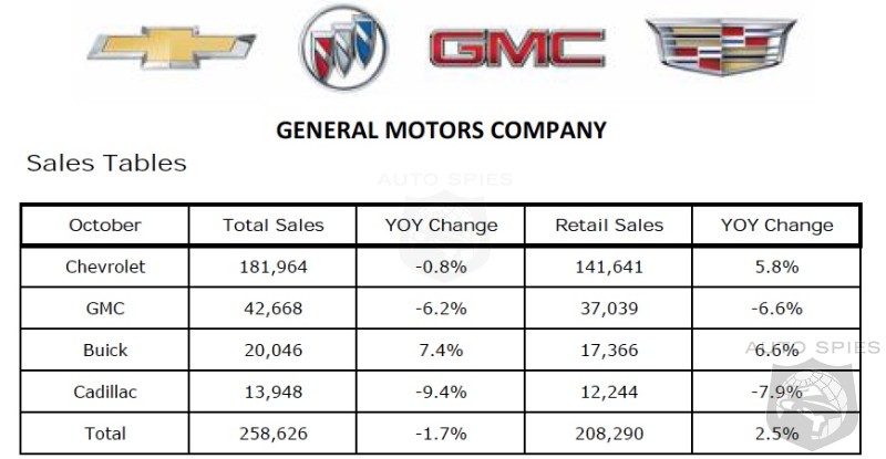 GM’s total U.S. sales in October were 258,626 vehicles, down less than 2 percent from last year. In addition, GM’s daily rental sales were down approximately 8,000 vehicles or about 19 percent in October compared to last year, as planned.