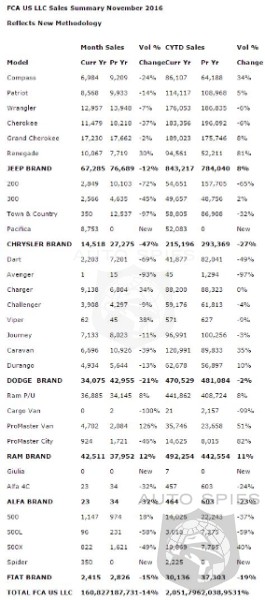 FCA US LLC today reported U.S. sales of 160,827 units, a 14 percent decrease compared with sales in November 2015 (187,731 units).