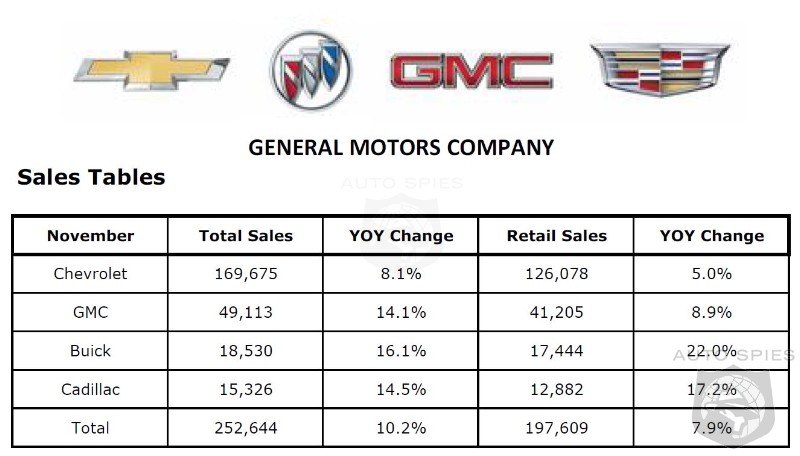 GM’s total U.S. sales in November were 252,644 vehicles, up more than 10 percent from last year. All four brands outperformed the industry in November with Buick, Cadillac and GMC posting double-digit gains.