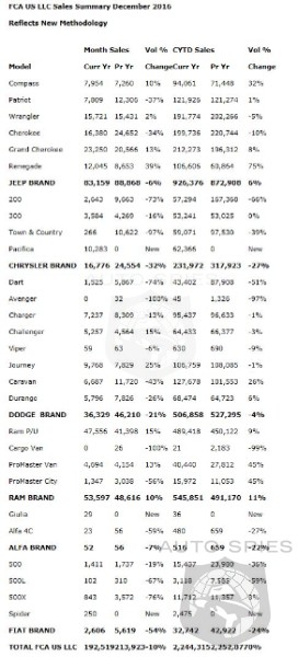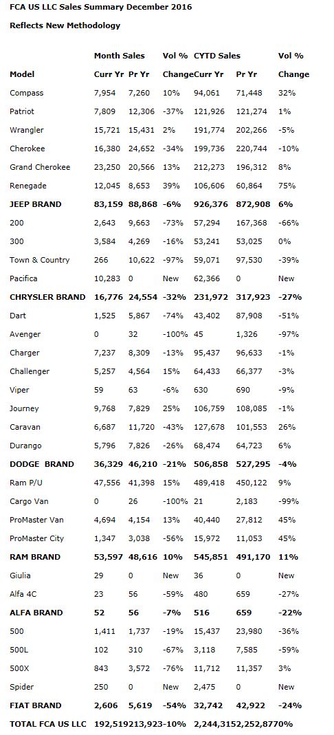 FCA US LLC today reported U.S. sales of 192,519 units, a 10 percent decrease compared with sales in December 2015 (213,923 units).