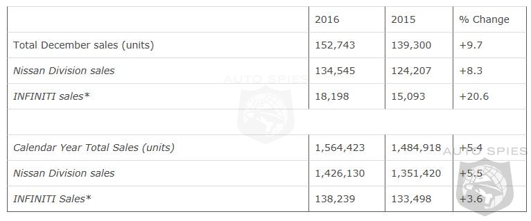 Nissan Group today announced total U.S. sales for December 2016 of 152,743 units, an increase of 9.7 percent over the prior year and a December record. For calendar year 2016, Nissan set an all-time record with 1,564,423 total U.S. sales, an increase of 5.4 percent. Nissan Division calendar year highlights: