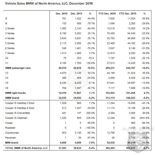 In total, the BMW Group in the U.S. (BMW and MINI combined) reported December sales of 37,493 vehicles, a decrease of 5.4 percent from the 39,634 vehicles sold in the same month a year ago. At year end, BMW Group (BMW and MINI combined) is down 9.7 percent on sales of 365,204 compared to 404,537 in 2015.