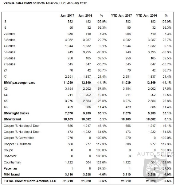 Sales of BMW brand vehicles increased 0.1 percent in January for a total of 18,109 compared to 18,082 vehicles sold in January, 2016. Notable vehicle sales in January include the BMW X1 which increased 21.4 percent, the BMW X3 which increased 57.5 percent, and the BMW X5 which increased 26.8 percent.
