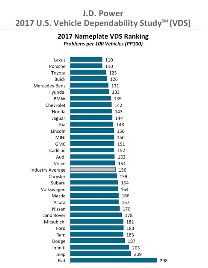 While Lexus and Porsche nameplates lead the industry in vehicle dependability, owners of many high-volume vehicles are also rewarded with excellent long-term quality, according to the J.D. Power 2017 Vehicle Dependability StudySM (VDS), released today.