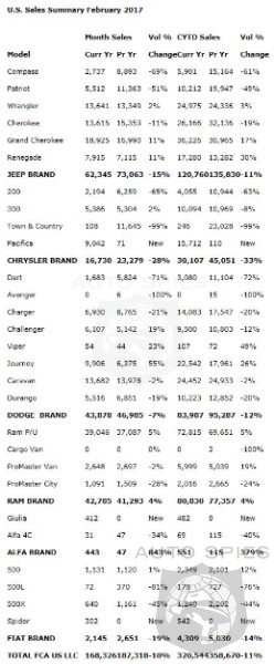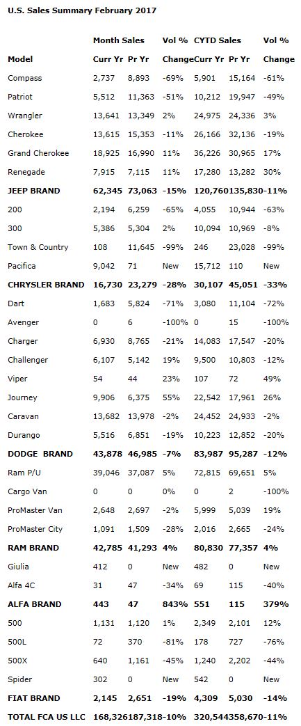 FCA US LLC today reported U.S. sales of 168,326 units, a 10 percent decrease compared with sales in February 2016 (187,318 units).