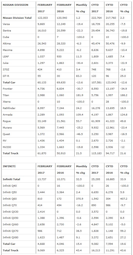 Nissan Group today announced total U.S. sales for February 2017 of 135,740 units, an increase of 4 percent over the prior year and a February record.
