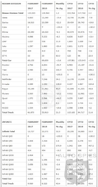 Nissan highlights:- Nissan Division finished February with 122,003 sales, up 1 percent and also a February record.