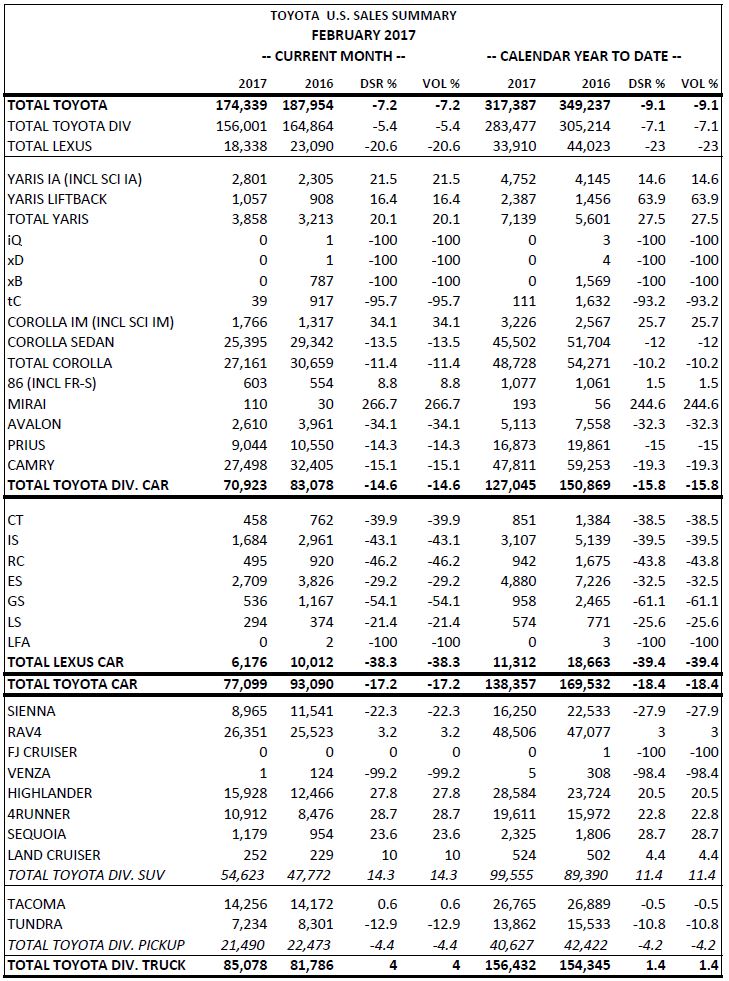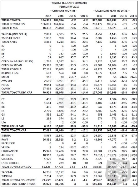 Toyota Motor North America (TMNA), Inc., today reported its US February 2017 sales of 174,339 vehicles, a decrease of 7.2 percent from February 2016 on a volume basis. With the same number of selling days in February 2017 compared to February 2016, sales were down 7.2 percent on a daily selling rate (DSR) basis.