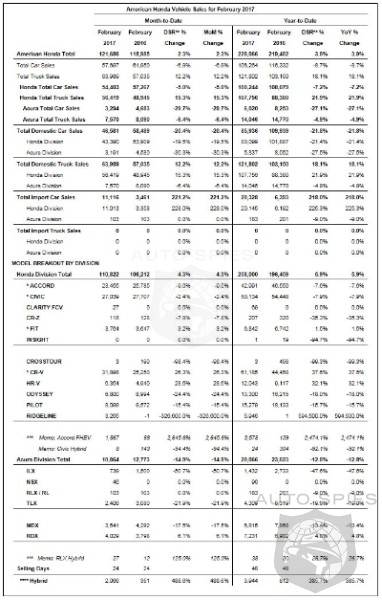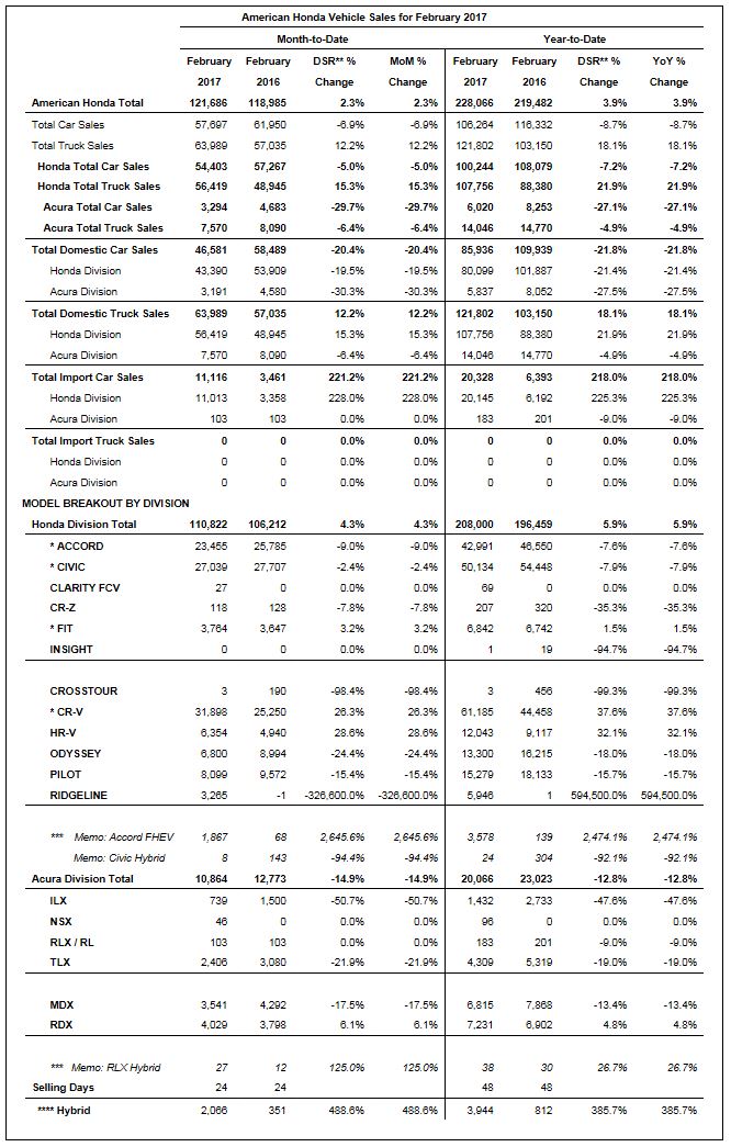 American Honda Motor Co., Inc. today reported total February sales of 121,686 Honda and Acura vehicles, an increase of 2.3 percent over February 2016 and a new record for the month. American Honda trucks also set a February record, rising 12.2 percent on sales of 63,989. Total Honda Division sales as well as Honda truck sales also set new February marks, with total Honda Division sales gaining 4.3 percent on sales of 110,822 and trucks up 15.3 percent on sales of 56,419 units. Acura Division sales were down 14.9 percent, with 10,864 vehicles sold in February. Honda