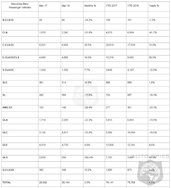 Mercedes-Benz today reported record first quarter year-to-date volume at 79,141 units, up 4.5% from 2016. March sales of 29,092 increased 3.3% from the same month last year. Adding 2,871 units for Vans and 389 units for smart, Mercedes-Benz USA (MBUSA) achieved a grand total of 32,352 vehicles for the month, up 2.0% from a year ago. Year-to-date, MBUSA also achieved a record close of 87,635 units, up 3.9%.