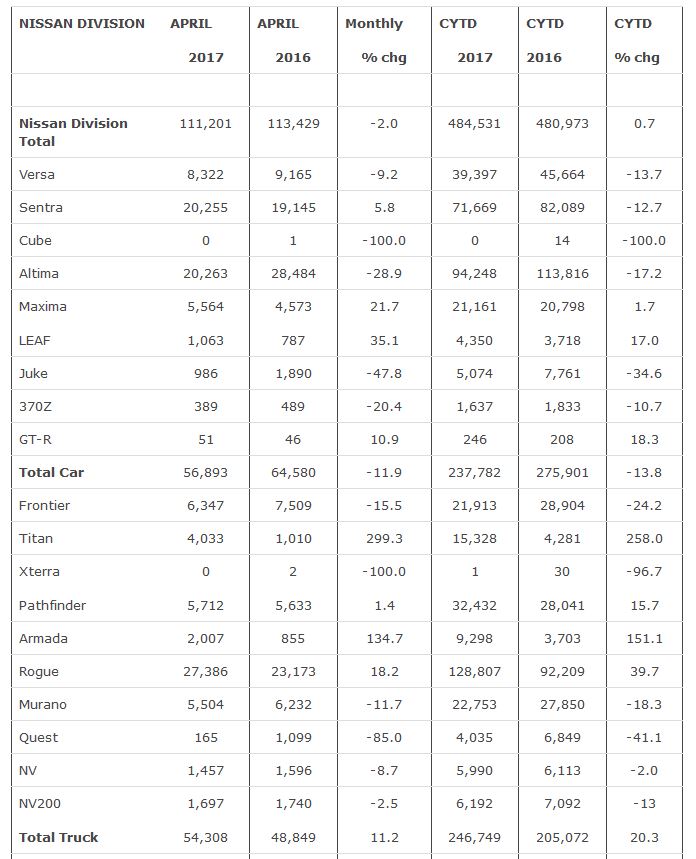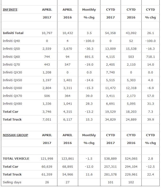 NOTE: To ensure consistency in global sales reporting, Nissan North America calculates monthly variances on a straight-percentage basis, unadjusted for the number of selling days. April 2017 had 26 selling days while April 2016 had 27 selling days.