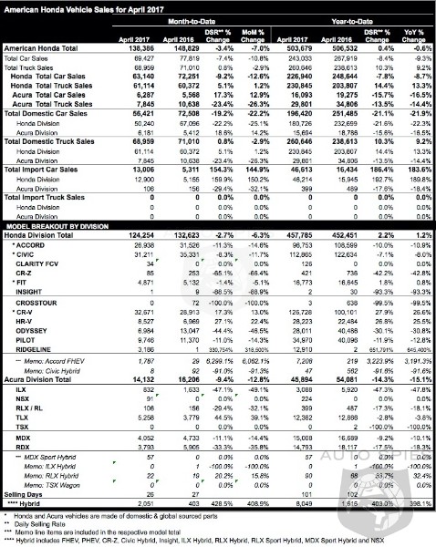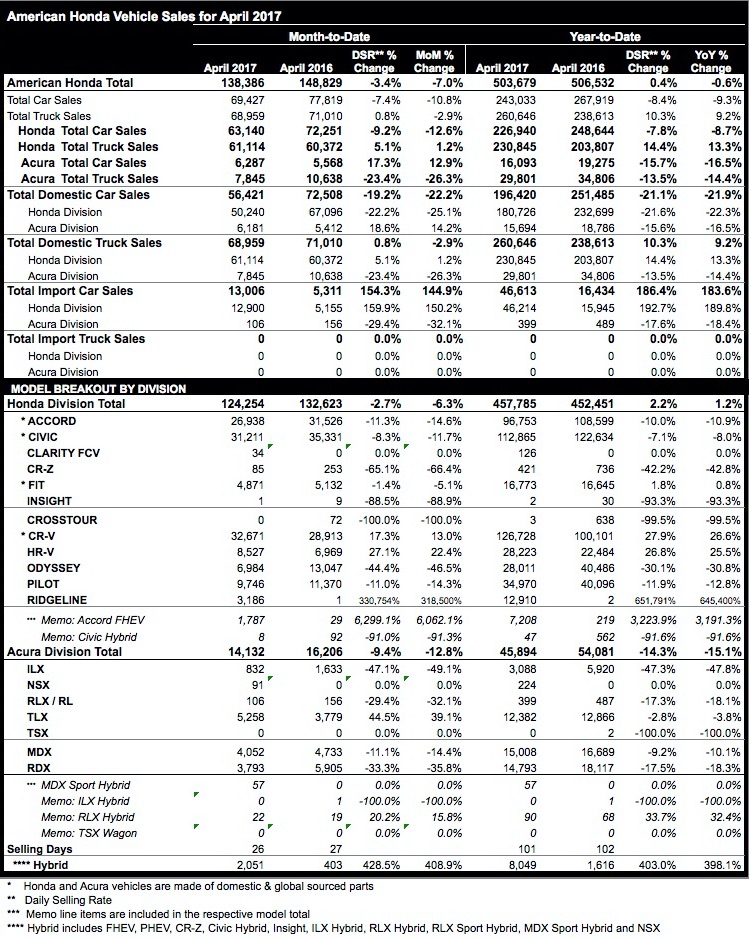 American Honda Motor Co., Inc. today reported April sales of 138,386 Honda and Acura vehicles, a decrease of 7.0 percent from year-ago results. The Honda Division saw a decrease of 6.3 percent on sales of 124,254 vehicles, while Honda trucks were up year-over-year, posting a 1.2 percent gain on sales of 61,114 units. Acura Division sales of 14,132 cars and SUVs were up from last month and were led by the TLX sedan with a 39.1 percent jump in April versus year-ago results.