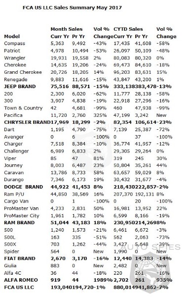 FCA US LLC today reported sales of 193,040 units, a 1 percent decrease compared with sales in May 2016 (194,720 units).