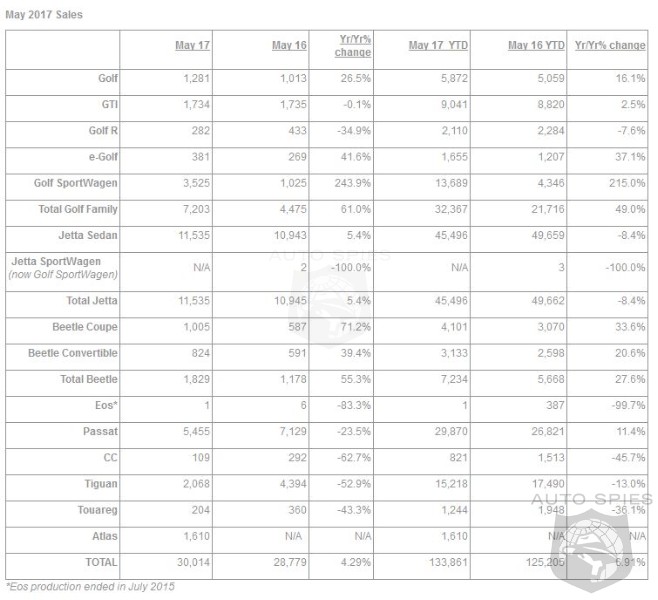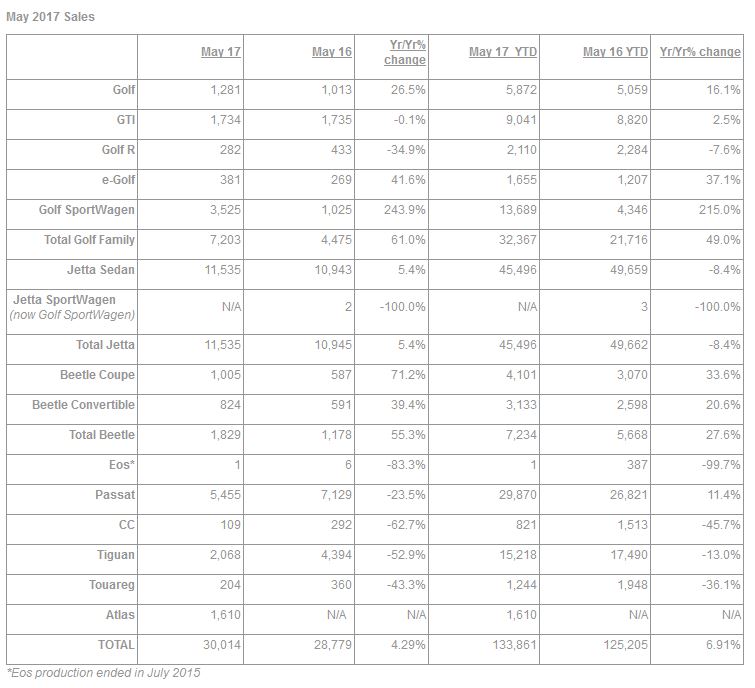 Volkswagen of America, Inc. (VWoA) today reported sales of 30,014 units delivered in May 2017, a 4.3 percent increase over May 2016. With 133,861 units delivered year-to-date in 2017, the company is reporting an increase of 6.9 percent in year-over-year sales.