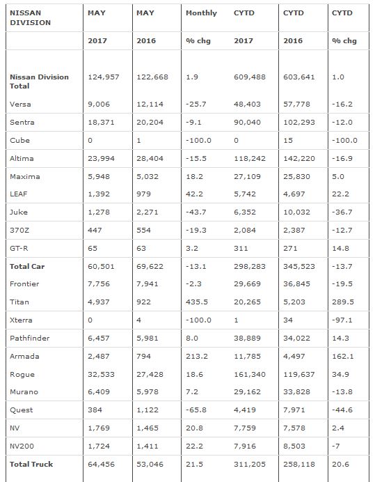 Nissan highlights: - Nissan Division finished May with 124,957 sales, up 2 percent.