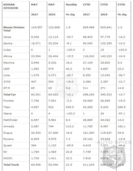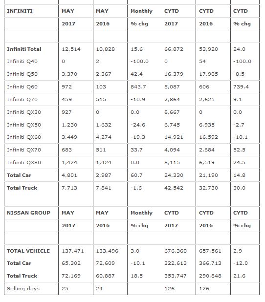 Nissan Group today announced total U.S. sales for May 2017 of 137,471 units, an increase of 3 percent over the prior year.