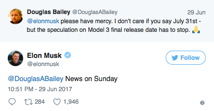 We only know this because Elon Musk himself replied to a Twitter user's request to end the speculation surrounding the Model 3's release date. Musk simply said "News on Sunday."