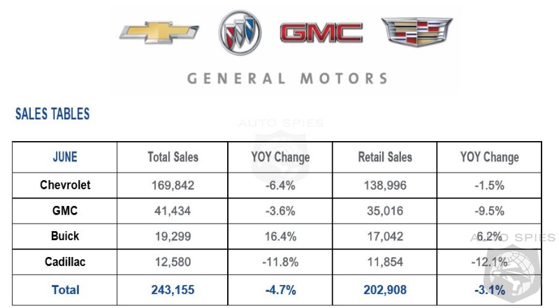 GM’s June total sales were 243,155 vehicles, down about 5 percent from the same period last year.