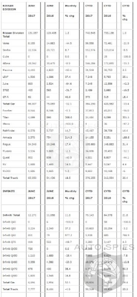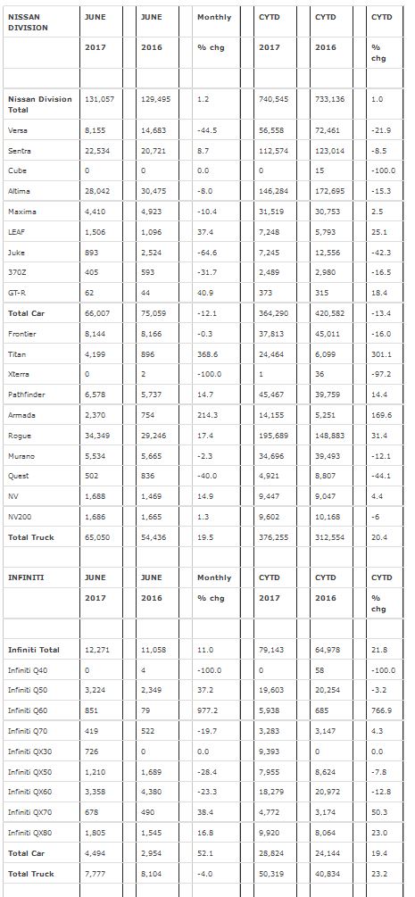 Nissan Group today announced total U.S. sales for June 2017 of 143,328 units, an increase of 2 percent over the prior year and a June record. Nissan highlights: