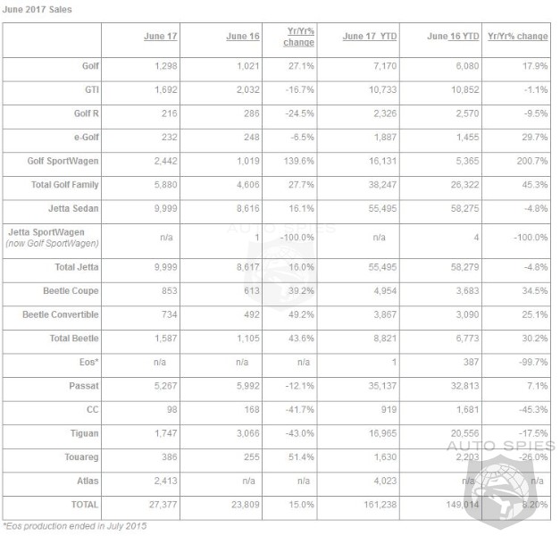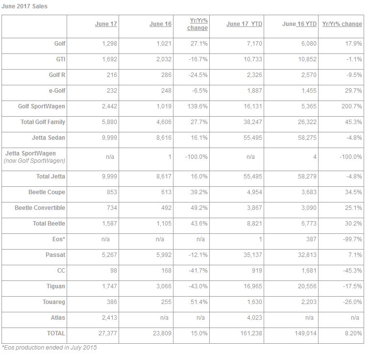 Volkswagen of America, Inc. today reported sales of 27,377 units delivered in June 2017, a 15 percent increase over June 2016. With 161,238 units delivered year-to-date in 2017, the company is reporting an increase of 8.2 percent in year-over-year sales.