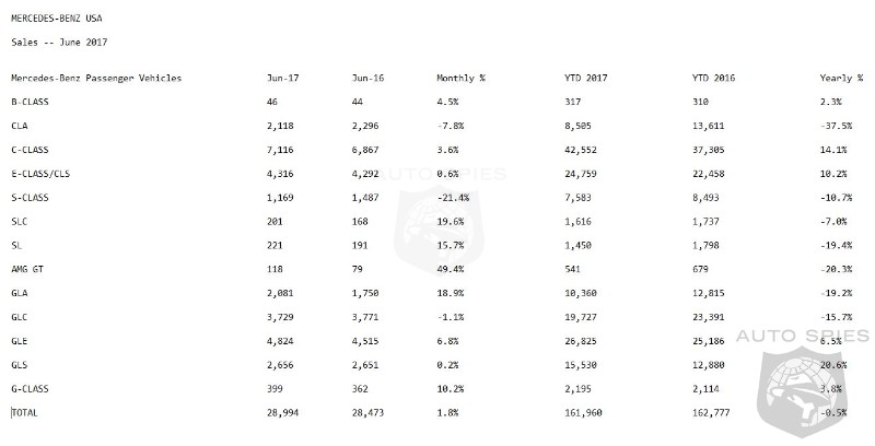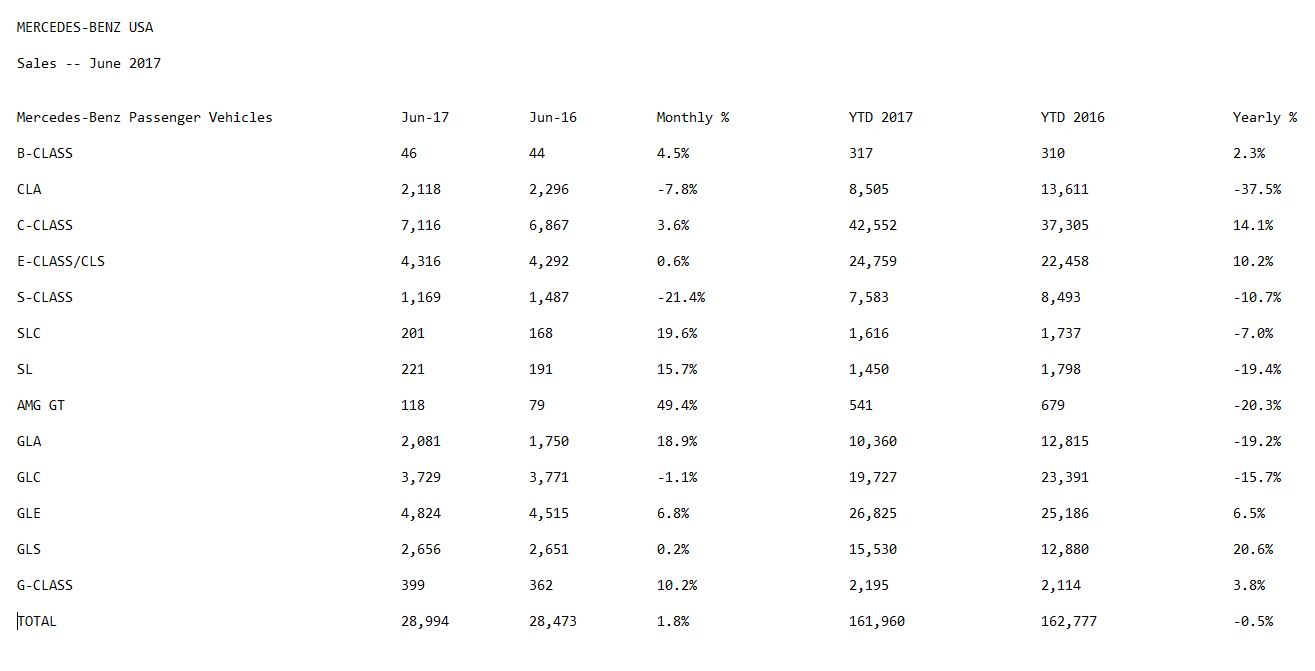 Mercedes-Benz USA (MBUSA) today reported best-ever June sales of 28,994 units, an increase of 1.8%, closing out the second-quarter at 161,960 year-to-date. Mercedes-Benz Vans also reported best-ever June sales with 3,108 units and smart reported 226 units, bringing the MBUSA grand total to 32,328 vehicles for the month, up 1.1% from last year.