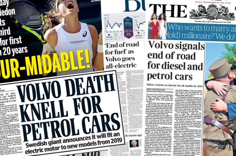 Volvo death knell for petrol cars - reads the front page of the Daily Mail today. 'Volvo signals end of road for petrol and diesel cars' proclaims the Times. The Telegraph's Business section front page goes further, with 'End of the road for fuel as Volvo goes all-electric'.