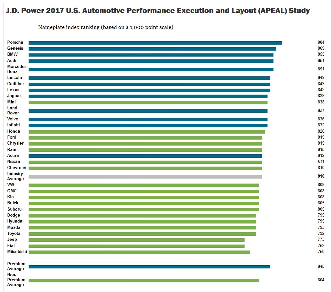 Several models score high both in the APEAL Study and in the J.D. Power 2017 U.S. Initial Quality StudySM (IQS). Eight of the models that earn APEAL segment awards also receive awards in the IQS: BMW 2 Series; Chrysler Pacifica; Kia Cadenza; Kia Niro; Kia Soul; Mini Cooper; Porsche 911; and Porsche Macan. The all-new Genesis brand ranks second in both APEAL and IQS this year, while Porsche is the highest-ranked nameplate in APEAL and third in IQS.