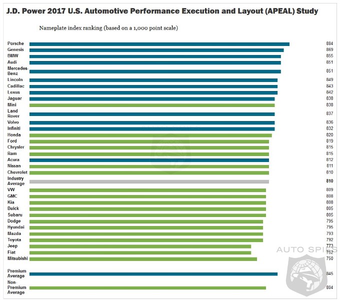 For a 13th consecutive year, Porsche (884) receives the highest overall APEAL score. Genesis (869) ranks second overall, followed by BMW (855), Audi (854) and Mercedes-Benz (851). Chrysler (815) is the most improved brand—scoring 41 points higher than last year (774). Other badges that improved dramatically year over year include Mini (+30 points), Nissan (+27 points), and Honda (+25 points).