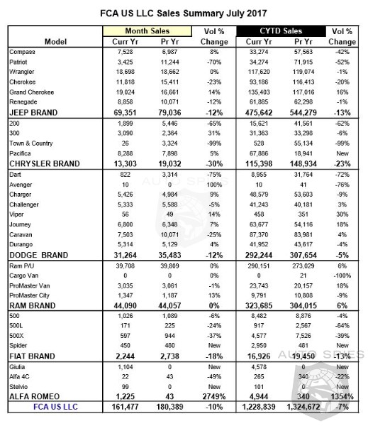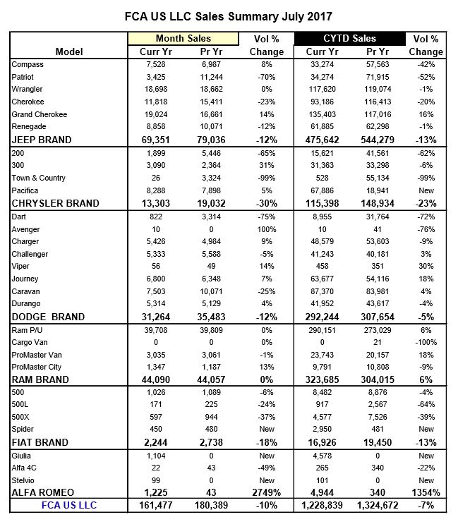 FCA US LLC today reported sales of 161,477 units, a 10 percent decrease compared with sales in July 2016 (180,389 units).