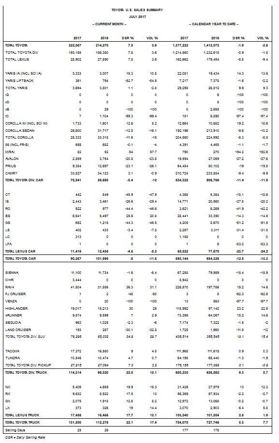 "In July, Toyota division saw its strongest month of the year so far, and our second consecutive month of year-over-year increases based on sales volume," said Jack Hollis, group vice president and general manager, Toyota division. "We are thrilled to see RAV4 sales top 40,000 units in a single month – it is not only a milestone for us, but has set a new best-ever, all-time record monthly total. We continue to see momentum in the industry for light trucks, and are positioned well with strong availability of our SUVs. We are equally excited that the all-new 2018 Camry is receiving a strong reception as it started to hit dealer showrooms last week."