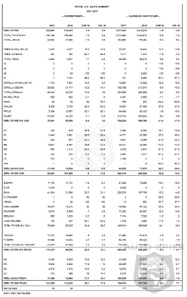 Toyota Motor North America (TMNA) Inc., today reported July 2017 sales of 222,057 units. With the one less selling day in July 2017 compared to July 2016, sales were up 3.6 percent on volume and up 7.8 percent on a daily selling rate (DSR) basis. Toyota division posted July sales of 193,155 units, up 3.6 percent on a volume basis, and up 7.8 percent on a DSR basis.