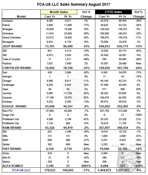 FCA US LLC today reported sales of 176,033 units, an 11 percent decrease compared with sales in August 2016 (196,805 units).