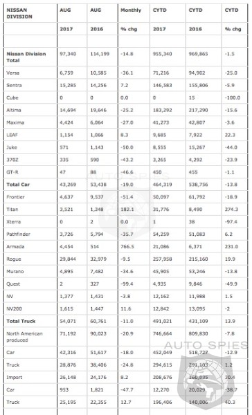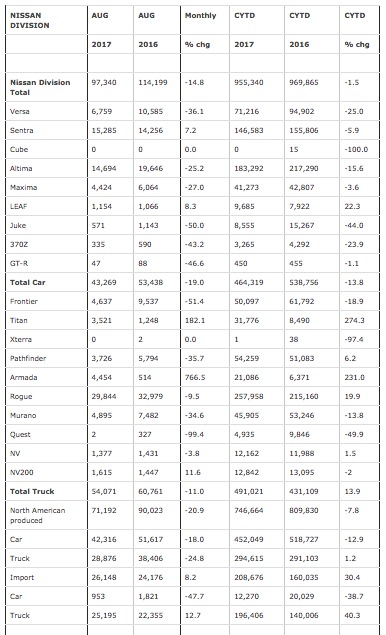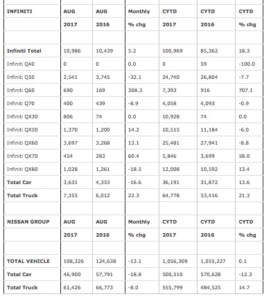 Nissan Group announced total U.S. sales for August 2017 of 108,326 units, a decrease of 13 percent from last year. Nissan highlights: