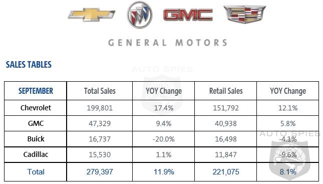 General Motors today reported a 12 percent year-over-year increase in total sales in September to 279,397 units, driven by a 17 percent increase at Chevrolet and an 9 percent increase at GMC. - Crossover deliveries were up 43 percent, trucks were up 10 percent and passenger cars were down 11 percent.