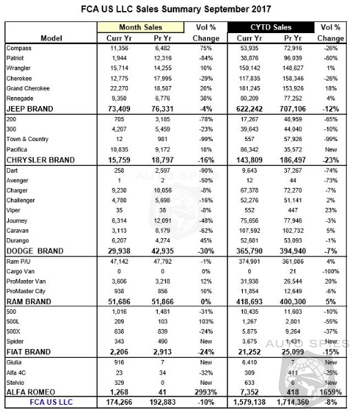 FCA US LLC today reported sales of 174,266 units, a 10 percent decrease compared with sales in September 2016 (192,883 units).