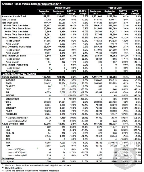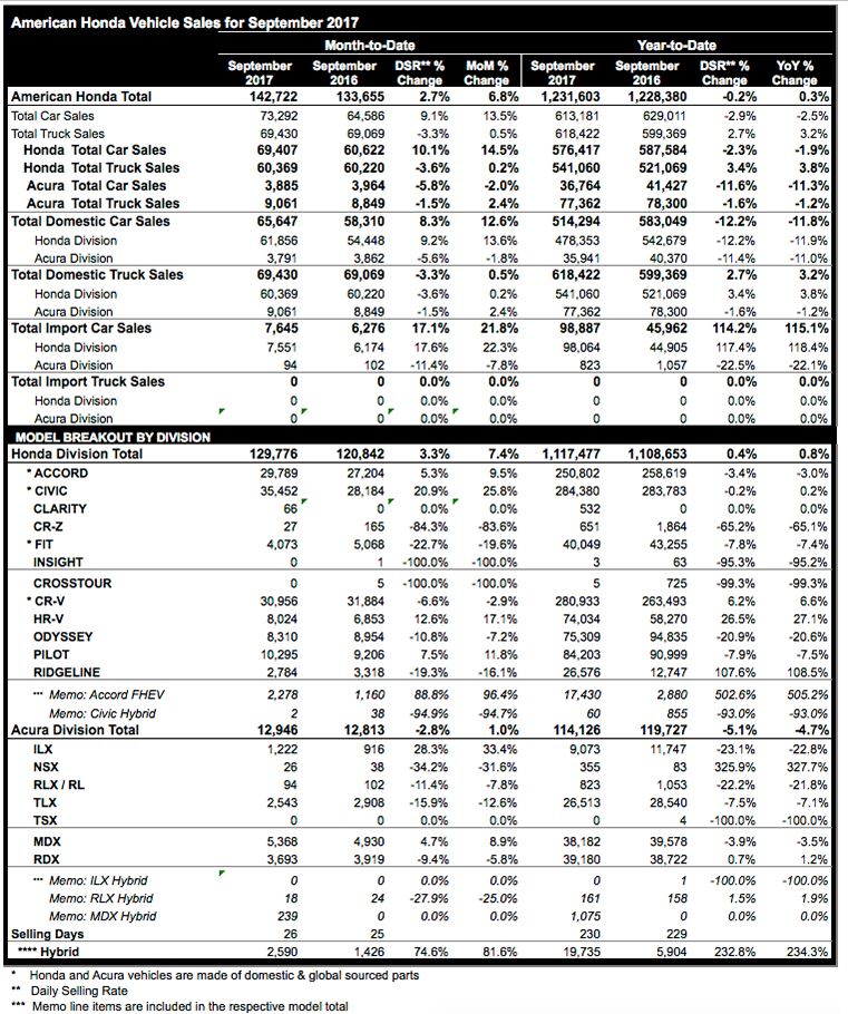 American Honda Motor Co., Inc. today reported best-ever September total sales of 142,722 Honda and Acura vehicles, an increase of 6.8 percent vs. September 2016. Honda Division also set a new September record, gaining 7.4 percent on sales of 129,776 units. Honda cars and truck both set September records, with cars gaining 14.5 percent on sales of 69,407, and trucks up 0.2 percent on sales of 60,369 units, even as supplies of key truck models remain tight. Acura Division sales rose 1.0 percent on sales of 12,946 vehicles for the month, with trucks setting a new September record—gaining 2.4 percent on sales of 9,061 units.